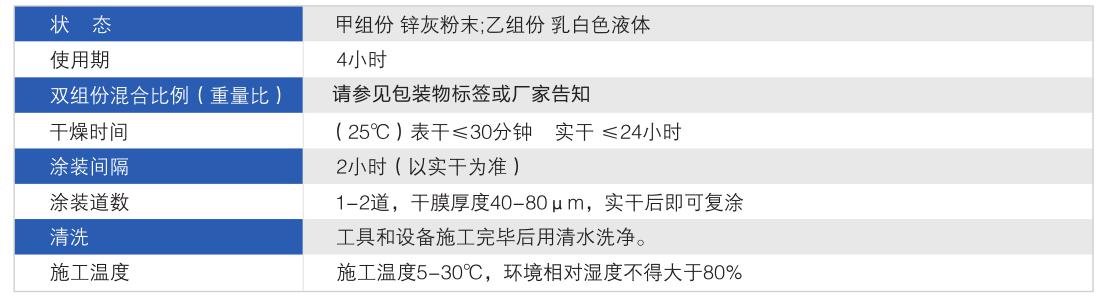 該產(chǎn)品是一種水性雙組份無機(jī)富鋅底漆,由納米改性硅酸鹽溶液,助劑及鋅粉等組成,甲、乙兩組份獨(dú)立包裝。